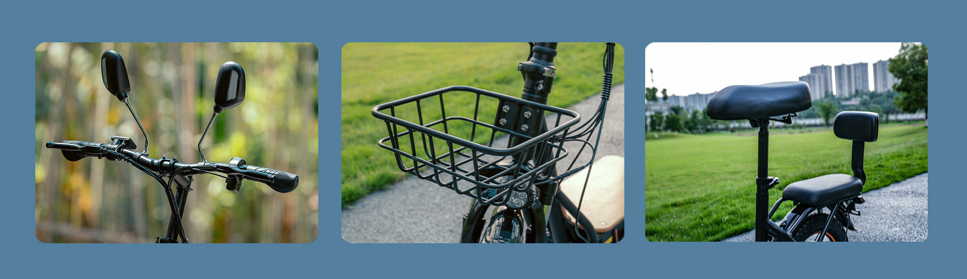 A - Pince de réglage hauteur B - Pince de pliage C - Pneu 14 pouces